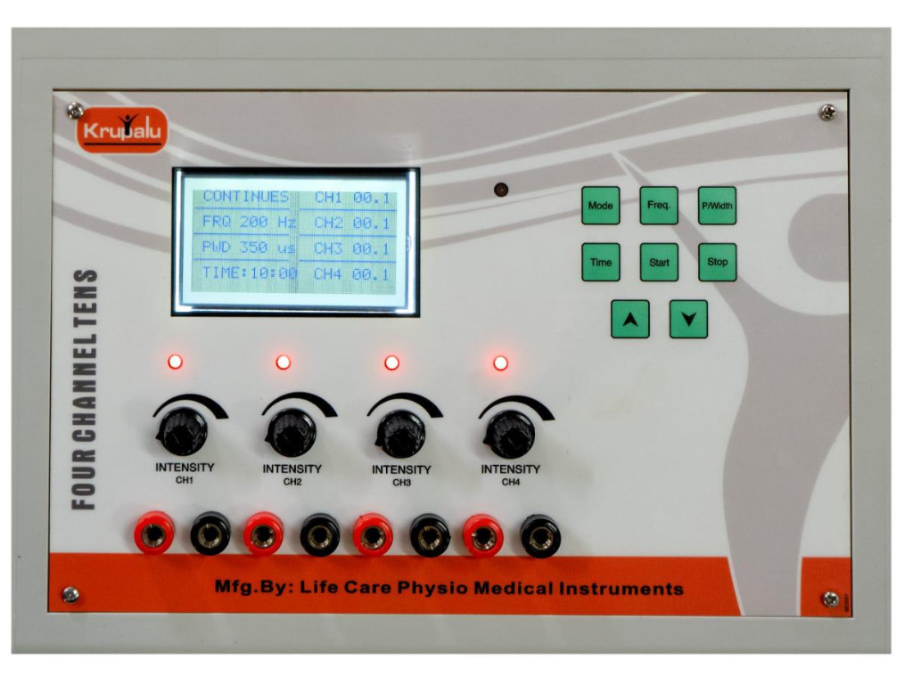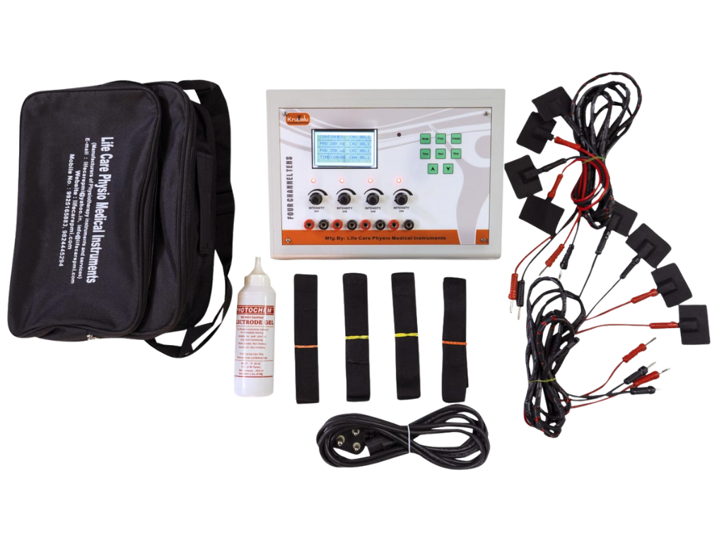 The Computerised Four Channel TENS with NMES – LC 270 is an advanced electrotherapy device equipped with ten different current types for targeted pain management, muscle stimulation, and rehabilitation. Featuring a large white graphical display, feather-touch controls, and SMPS-based lightweight design, it delivers accurate therapy with multiple adjustable modes for professional physiotherapy use.